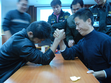 大家開始抽號碼,首先由抽取1號的兩位“大力士”PK,依次類推,在他們各自粉絲團和大家的加油吶喊聲中,我們的前8強“大力士”產(chǎn)生了。最激烈的要數(shù)4號的兩位“大力士”,他們勢均力敵,只見他們兩個臉憋的通紅,可是對方的手卻紋絲不動。剛把對方掰的歪倒了點兒,又被對方掰回來,這樣反復(fù)了幾次后,終于見了分曉。真是精彩!然后我們又在8強中賽出4強,4強中,其中一組兩位大力士掰了3個回合,最后國巨一廠的王銀龍勝出,休息片刻之后,我們要開始搶冠軍寶座了,由國巨二廠的隊長王允亮和他的隊員潘建軍PK,隊長就是隊長,果真不一般,以壓倒性優(yōu)勢連勝兩盤。哇,太厲害了!最后,由潘建軍VS王銀龍,王銀龍沒受失敗情緒的影響,反而越戰(zhàn)越勇,搶到了亞軍寶座。