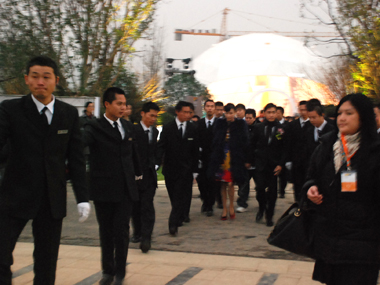 11點(diǎn)開始,隊(duì)員開始疏散現(xiàn)場所有閑雜人員,12點(diǎn)的時候,清理完畢。13點(diǎn)進(jìn)入布防崗位,14點(diǎn)我們的特保乘專車趕往梁朝偉和劉嘉玲下榻的酒店。15點(diǎn)整,梁朝偉、劉嘉玲亮相,他們在貴賓休息室里稍作休息后,進(jìn)入新聞發(fā)布會現(xiàn)場,梁朝偉和劉嘉玲在我司8名隨身特衛(wèi)的保護(hù)下閃亮登場。同時到場的還有華麗家族的王偉林董事長及其夫人一行。隨后, “華麗家族.太上湖”全球第一買家簽約儀式及記者招待會開始,由著名主持人曹可凡和陳蓉主持。8名特衛(wèi)寸步不離兩位重量級嘉賓,其余隊(duì)員則負(fù)責(zé)外圍安全。